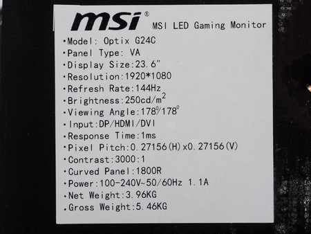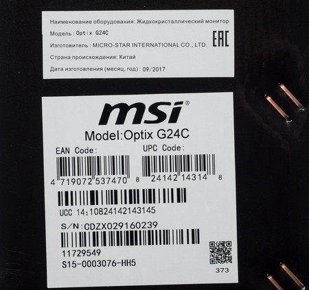 Комплект поставки MSI Optix G24C включает в себя следующее: