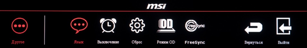Предпоследний раздел «Другое» собрал в себе выбор локализации OSD экрана, таймер выключения, заводской сброс к настройкам по умолчанию, включение FreeSync и изменении режима разгона матрицы OverDrive. Последний пункт в основном меню – «Выход», но можно обойтись и без него, просто нажав четвёртую из основных управляющих клавиш.