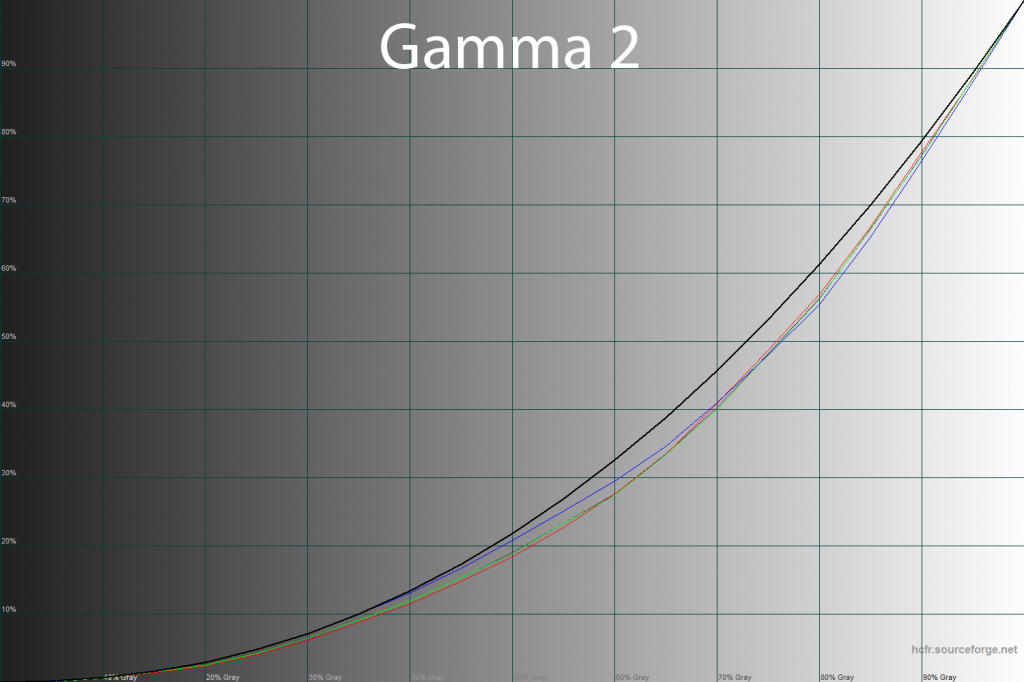 По умолчанию выставлено значение Гамма 2. При установке Гамма 1 картинка резко теряет в контрастности, появляется сильная различимость на крайних тёмных оттенках. Становится хуже, чем было. Смысла от такой «калибровки» мы не видим. Да его просто нет и всё тут…