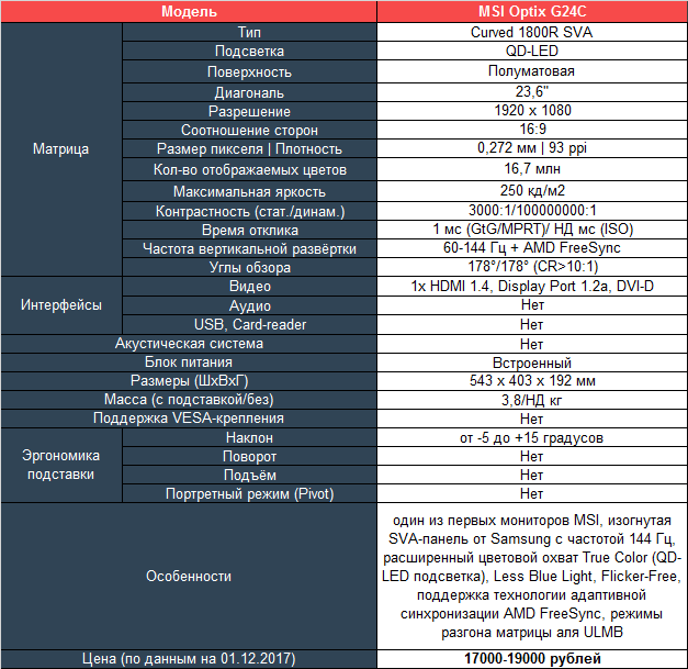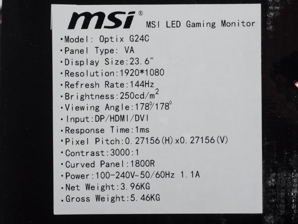 Исходя из ТХ модели и известных матриц на рынке, основой для Optix G24C послужила SVA-панель от Samsung - LSM236HP02, представленная в апреле 2016 года. Это 23,6-дюймовая изогнутая (1800R) 8-битная (без FRC) матрица с разрешением 1920 x 1080 пикселей, соотношением сторон 16:9, подсветкой на базе квантовых точек (QD-LED, о чём, конечно же, в MSI умалчивают) и соответствующим ей – несколько расширенным цветовым охватом, называемым в компании - True Color.