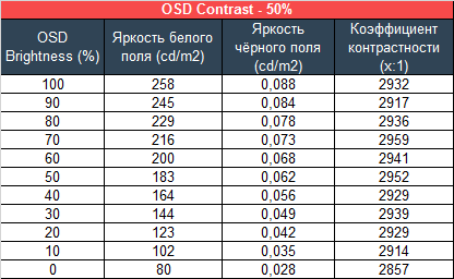 Для изучения стабильности контрастности и диапазона изменения яркости был выставлен режим Standard. Значение Brightness менялось с 100 до 0% с шагом в 10 единиц. Для представленной ниже таблицы измеренные значения были получены через программу HCFR, которая даёт возможность более точно оценить уровень чёрного (три знака после запятой) и соответственно определить достоверный коэффициент контрастности.