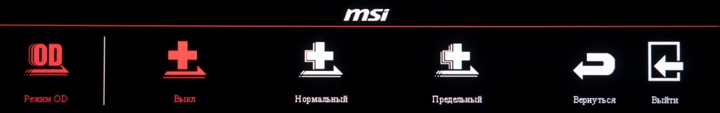 При активации двух следующих режимов разгона OD яркость монитора блокируется на более низких уровнях, чем при настройках по умолчанию. Происходит «стробление» вставка «чёрного кадра» на частоте сопоставимой с частотой вертикальной развёртки. В этом случае подсветка синхронно выключается с каждой сменой кадра на довольно продолжительную величину времени (в мс), что создаёт эффект работы за CRT монитором, без шлейфов за движущимися объектами. Но такова теория и практика на примере других моделей (в разы более дорогих). У новинки же от MSI скважность при мерцании невелика, подсветка выключается на очень короткие промежутки времени, увидеть разницу в плавности движения объектов на экране – крайне проблематичная задача. Как итог – советовать использовать другие режимы OD (отличные от заводских установок) – мы не можем. Уловить разницу – это их области фантастики.