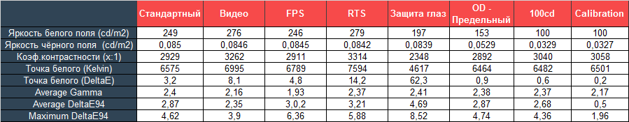 Для получения яркости 100 нит, цветовой температуры белой точки в 6500K и прочих улучшений мы выставили следующие настройки: