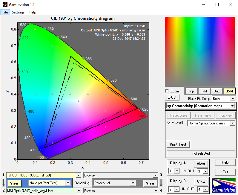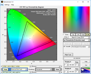 Первоначальная проверка осуществлялась при заводских настройках дисплея. По представленным скриншотам видно, что монитор по своим возможностям значительно превосходит стандарт sRGB на большинстве цветов. С одной стороны это плюс (для тех, кто любит насыщенные и яркие цвета), с другой минус (необходимо использовать цветовой профиль с ПО с поддержкой системы управления цветом для приведения цветов к определённому стандарту).
