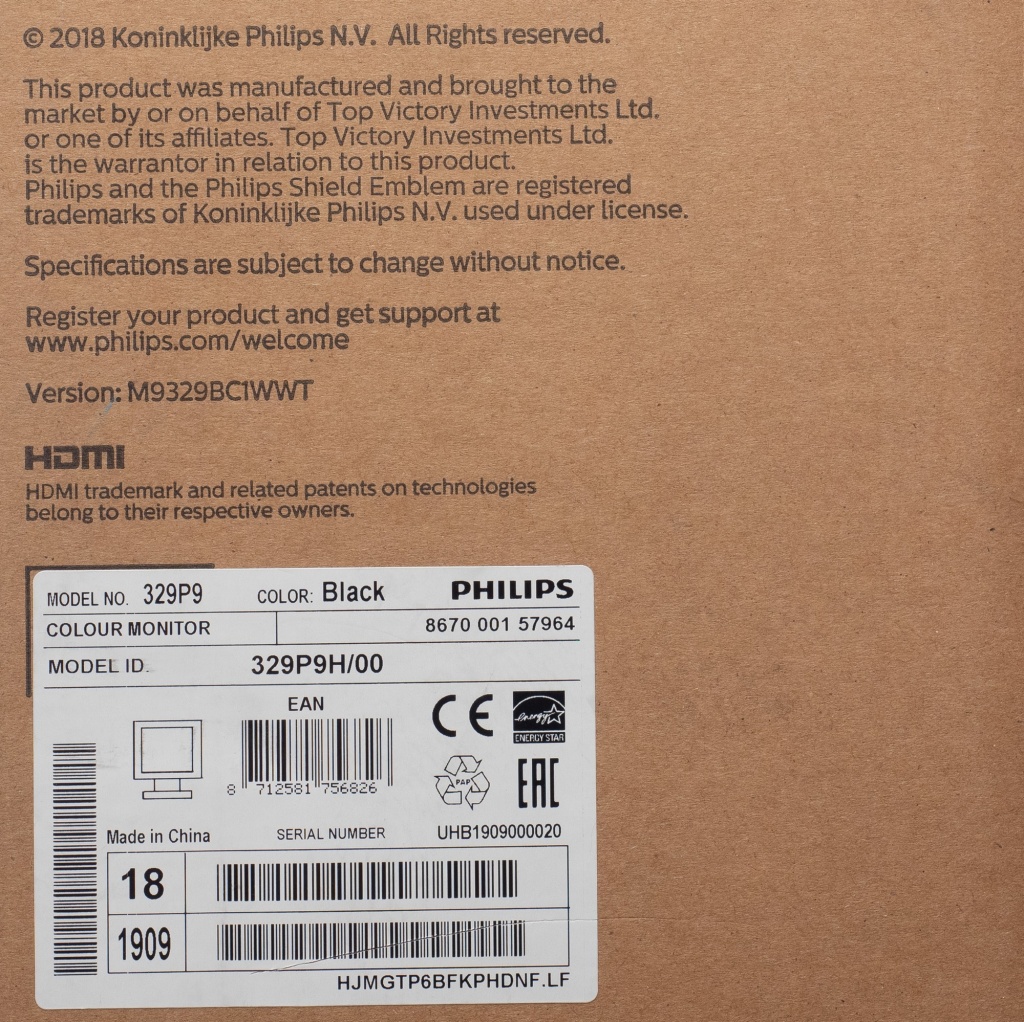 Сзади корпуса покупатель обнаружит одну наклейку. По ней можно узнать дату (февраль 2019 года) и место производства (Китай), название модели, серийный номер, номер партии и энергопотребление. Кроме того, присутствуют данные по соответствию экологическим и стандартам безопасности. Реальный производитель – MMD Monitors & Displays. Philips, в данном случае, выступает лишь как знакомый для многих бренд/марка.