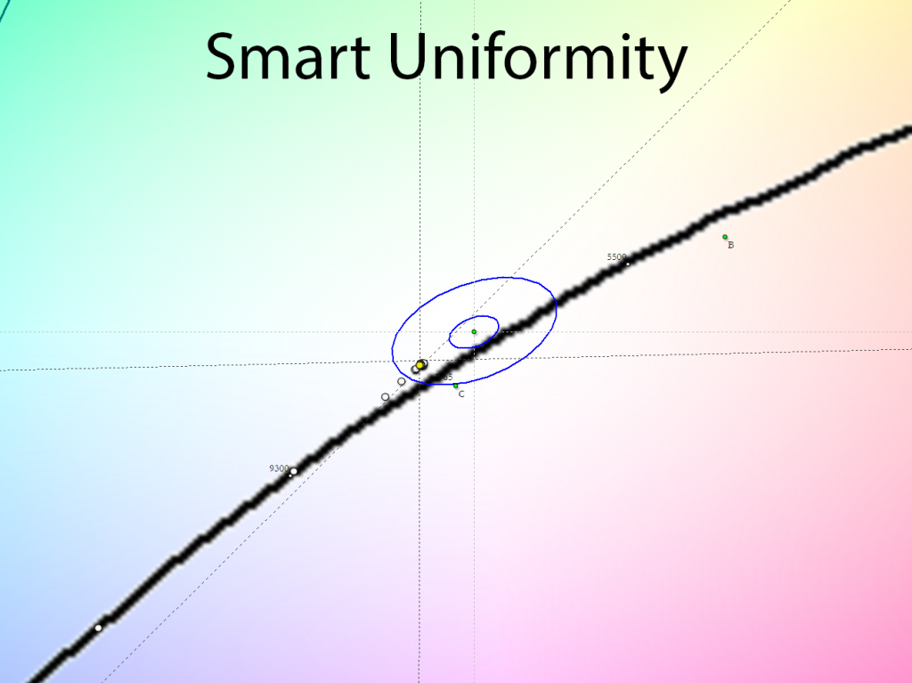 После настройки под нужную яркость и ЦТ, что в режиме Off, что в SmartUniformity результаты оказались максимально похожи. Разница, увы, в пределах погрешности измерений. И можно было бы заявить, что мы нарушили работу системы выставив иные параметры, но нет – это не так. Она просто так «работает».