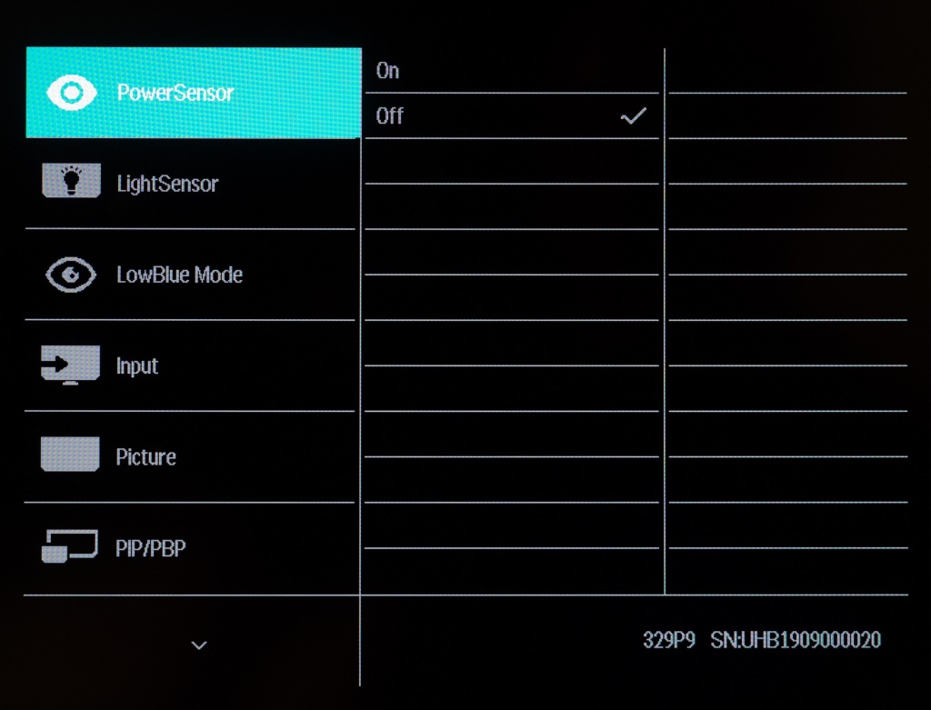 Первые четыре раздела отданы под активацию двух сенсоров (PowerSensor, LightSensor), включение режима LowBlue Mode и выбор источника сигнала. Никакие дополнительные/тонкие настройки не представлены.